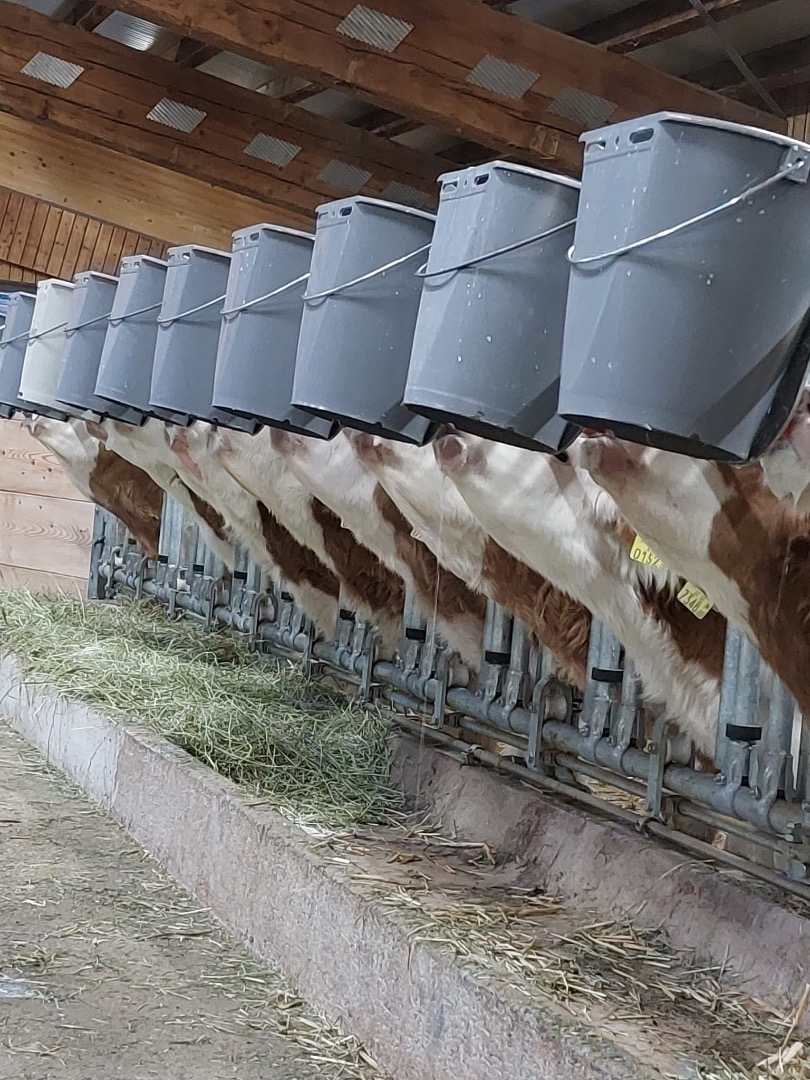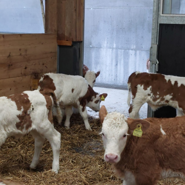 Unsere süßen Kälbchen sind sehr verschmust und mögen es gerne gestreichelt und geknuddelt zu werden. Sie dürfen nach ca. einem Tag in eine seperate Box zu ihren Freunden und können hier mit ihren Artgenossen schmusen und kuscheln. In den ersten Tagen bekommen Sie die Milch von ihrer Mama in einem speziellen "Zuzlkiwi" gefüttert. Da sich Kälbchen leicht ablenken lassen, sollten sie beim Trinken viel Zeit und Ruhe haben. Zu Beginn sind die kleinen Kälbchen oft noch etwas zurückhaltender und schreckhaft und reagieren eher auf laute Geräusche oder schnelle Bewegungen. Wenn man ein Kälbchen gerne streicheln möchte, einfach ganz langsam und ruhig nähern.