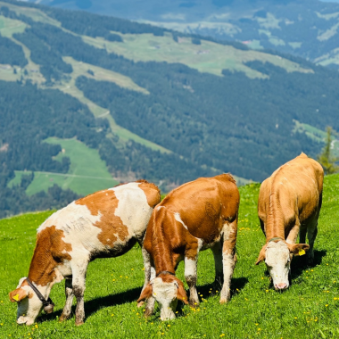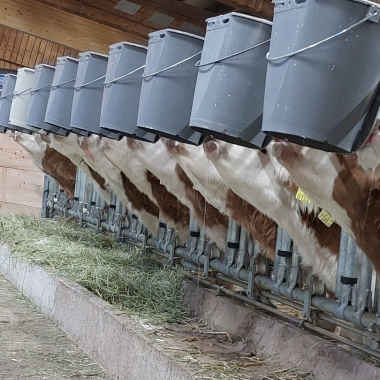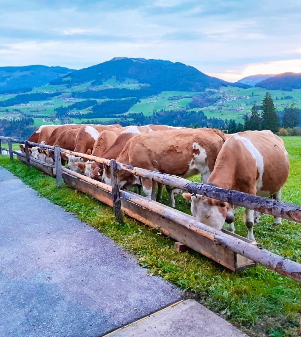Unsere Kühe bekommen von Oktober bis ende Mai, sehr hochwertiges Bio-Heu 2 Mal pro Tag gefüttert. Ende Mai bevor es auf die Alm geht, gibt es ein paar Mal leckeres Gras von unserer eigenen Wiese. Als kleines Zuckerl gibt es immer beim Melken, ob auf der Alm oder zu Hause, etwas Bio-Kraftfutter und als Durstlöscher frisches Bergwasser von der eigenen Quelle. Jede unserer Kühe im Stall hat ihren eigenen Namen, ihre eigene Nummer und einen ganz speziellen Charakter.