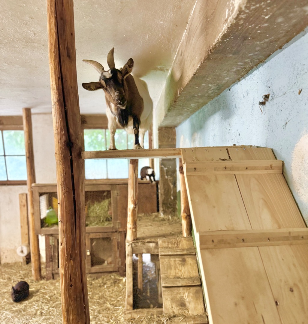 Unsere Kleintiere, Ziege, Wachteln und Hasen teilen sich gemeinsam einen großen Stall. Hasen und Ziege helfen sich gegenseitig und verstehen sich super. Die Wachteln sandbaden in der Sonne unter sicherem Nadelbaum. Ruhig und ungestört genießen sie ihren eigenen Bereich. Hasen puddeln sich ihre Hölen und Löcher und die Ziege kraxelt und genießt ihr kuscheliges Plätzchen.